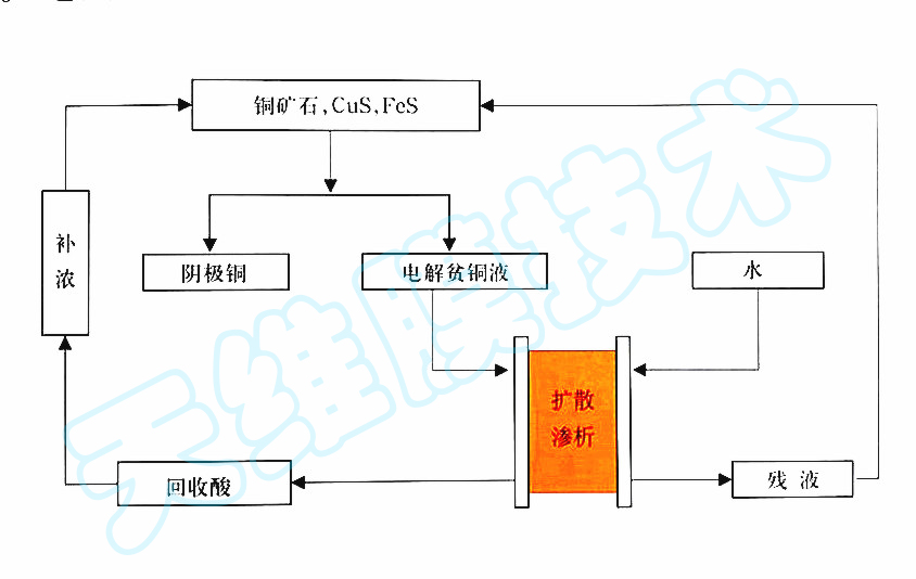 濕法煉銅生產(chǎn)中產(chǎn)生大量的電解貧液,若用石灰中和,除造成酸和銅的損失外,還引發(fā)環(huán)境問題。用陰膜擴(kuò)散滲析回收電解貧液中的廢酸再返回系統(tǒng)使用,這樣既為企業(yè)節(jié)約了資源,又解決了環(huán)境污染問題。